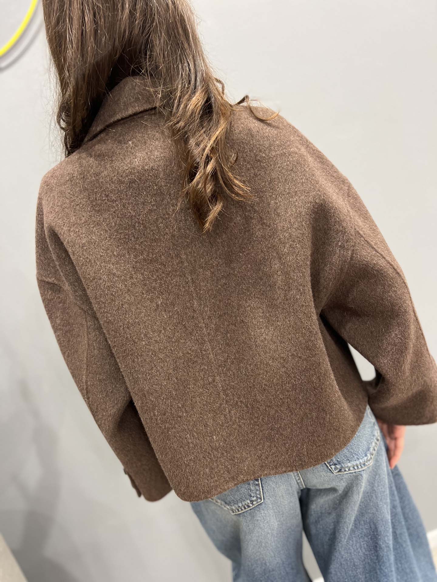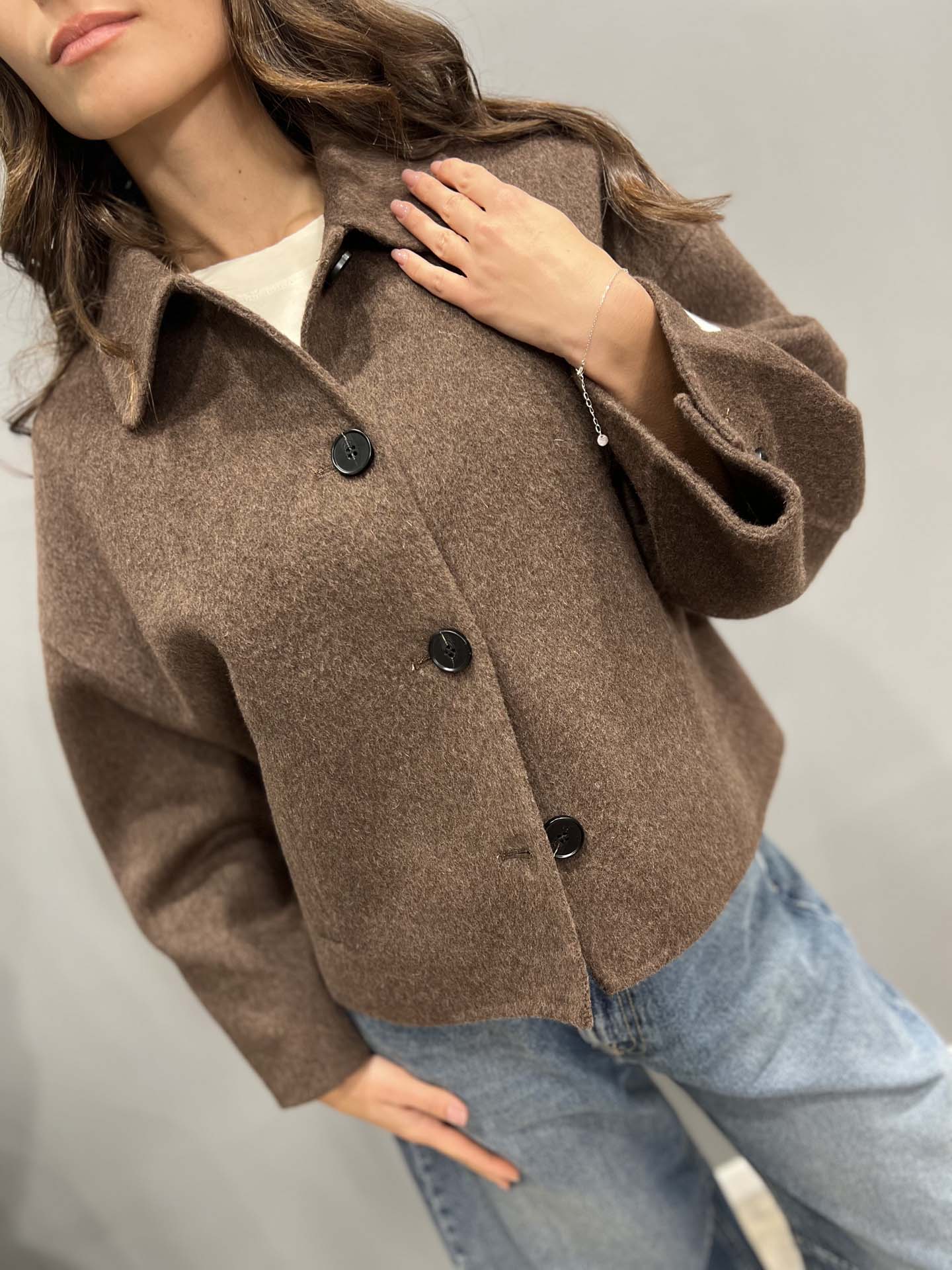 Cappotto corto marrone con colletto cachimire e lana