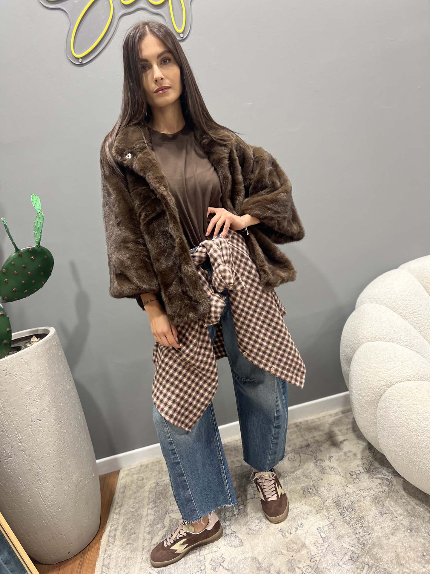 ecopelliccia marrone cacao con bottoni a clips