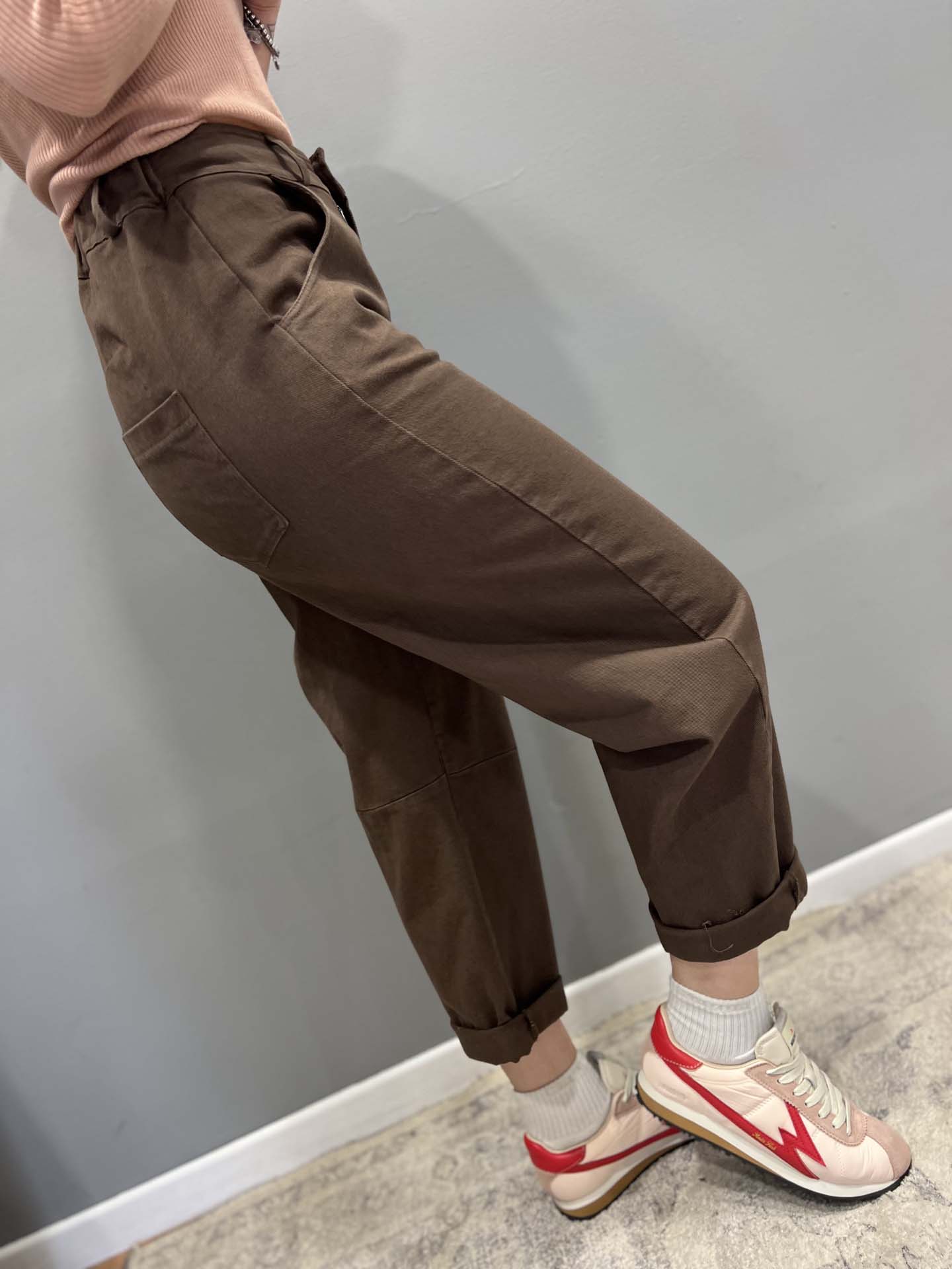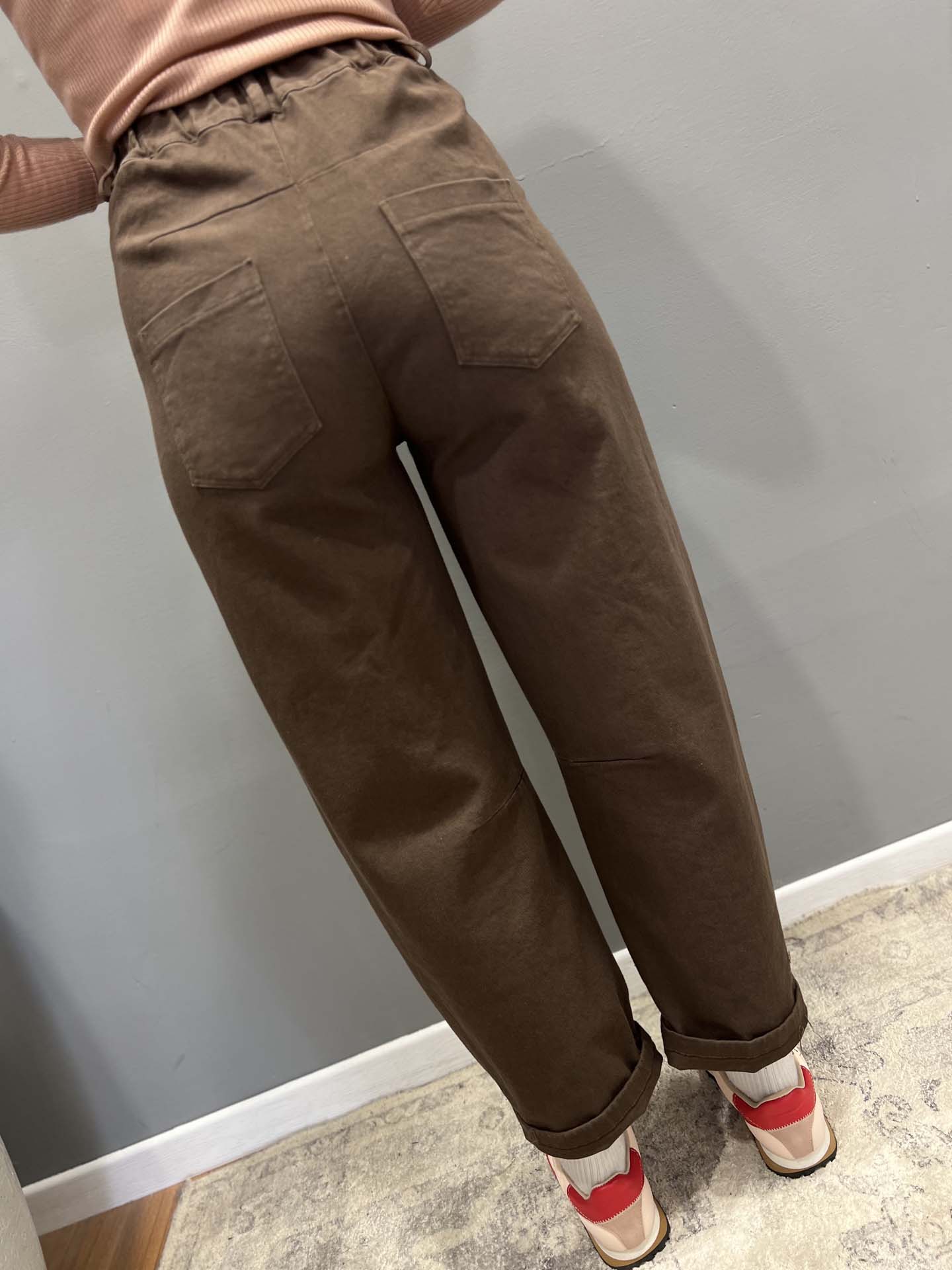 Jeans cacao baggy con pences ed elastico in vita