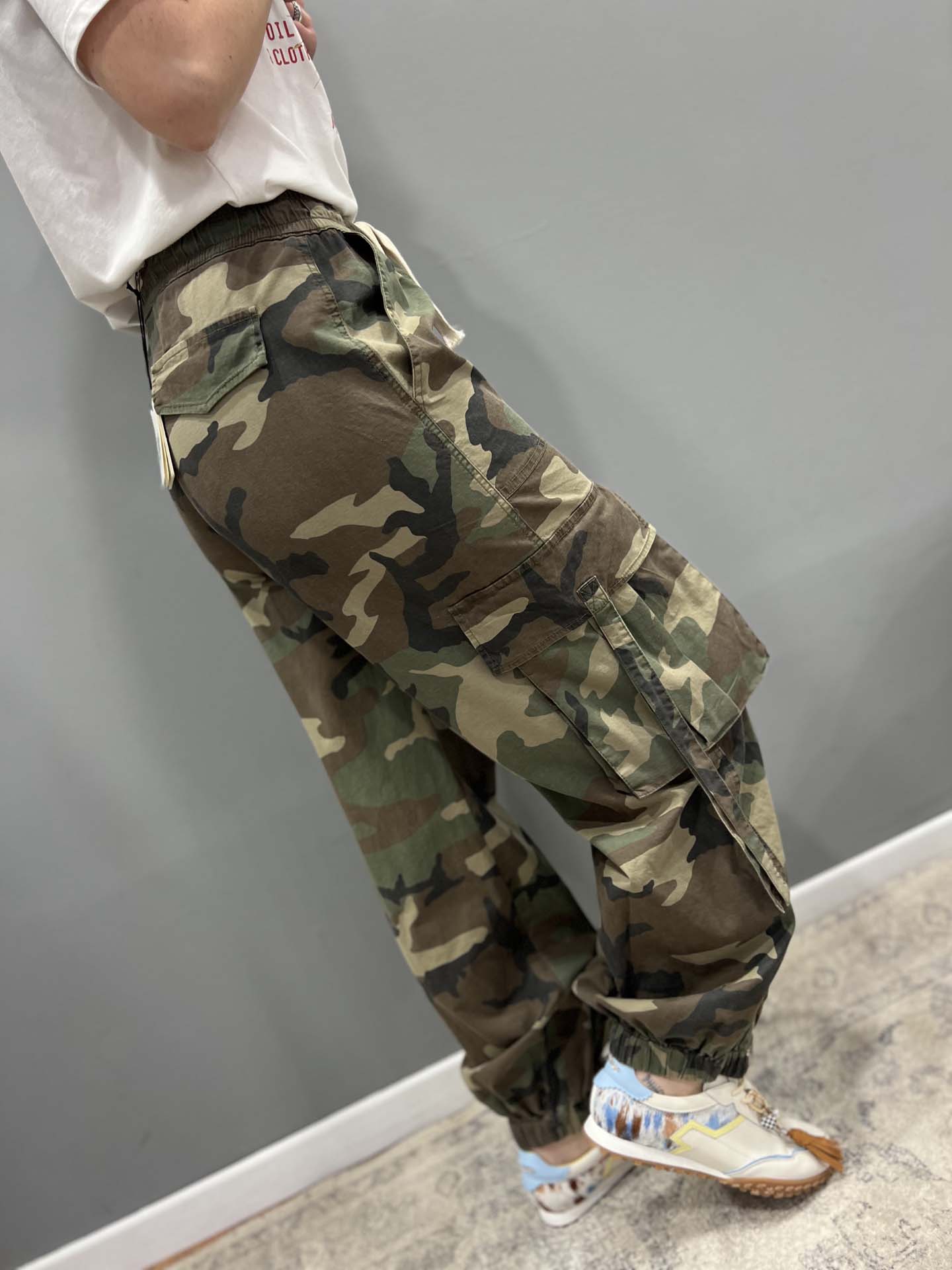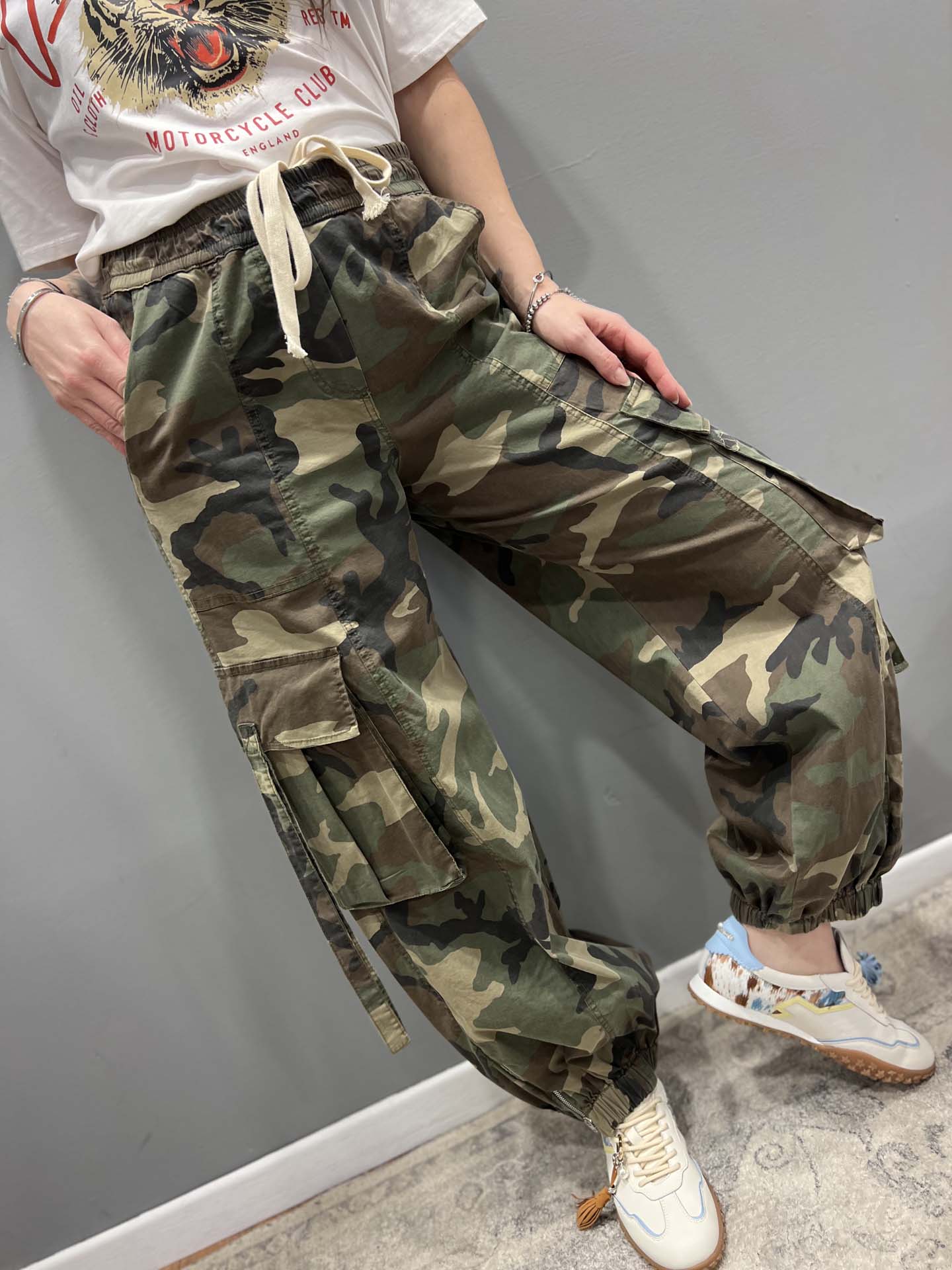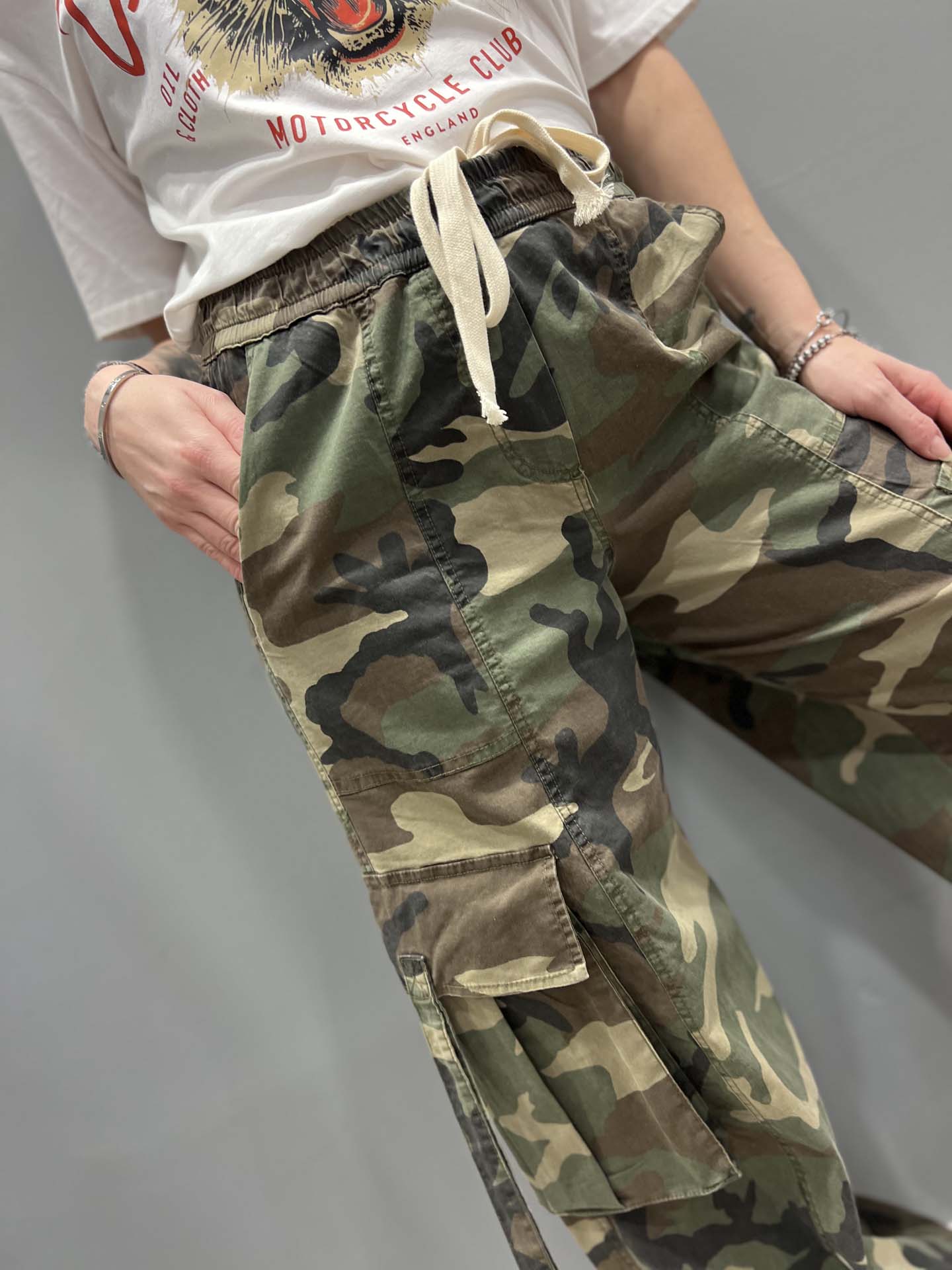 pantalone mimetico con cerniera infondo coulisse in vita